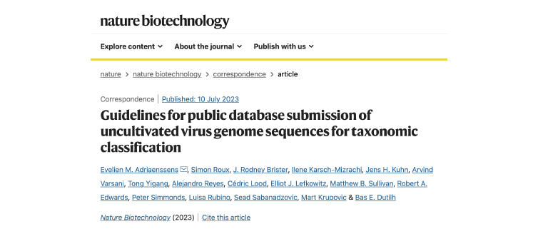 Evelien M. Adriaenssens, Simon Roux, J. Rodney Brister, Ilene Karsch-Mizrachi, Jens H. Kuhn, Arvind Varsani, Tong Yigang, Alejandro Reyes, Cédric Lood, Elliot J. Lefkowitz, Matthew B. Sullivan, Robert A. Edwards, Peter Simmonds, Luisa Rubino, Sead Sabanadzovic, Mart Krupovic & Bas E. Dutilh. Guidelines for public database submission of uncultivated virus genome sequences for taxonomic classification. Nat Biotechnol(2023). https://doi.org/10.1038/s41587-023-01844-2 (Free download.)