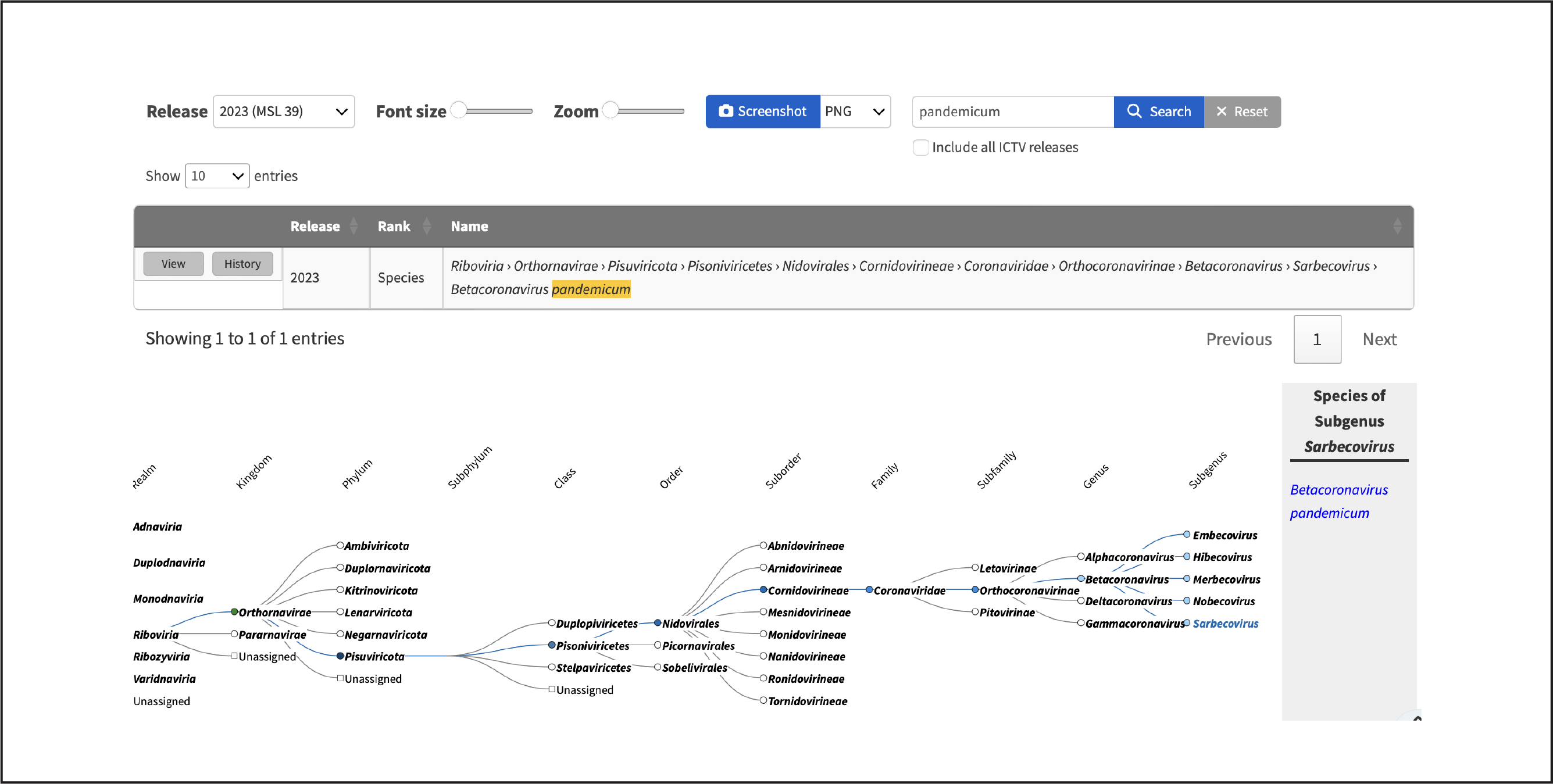 The new 2023 ICTV taxonomy is now available in both our traditional tabular browser: https://ictv.global/taxonomy and also in our new Visual Taxonomy browser: https://ictv.global/taxonomy/visual-browser . This second release of the visual browser adds new search capabilities to find your taxon of interest, and have the browser automatically expand to display the selected taxon.