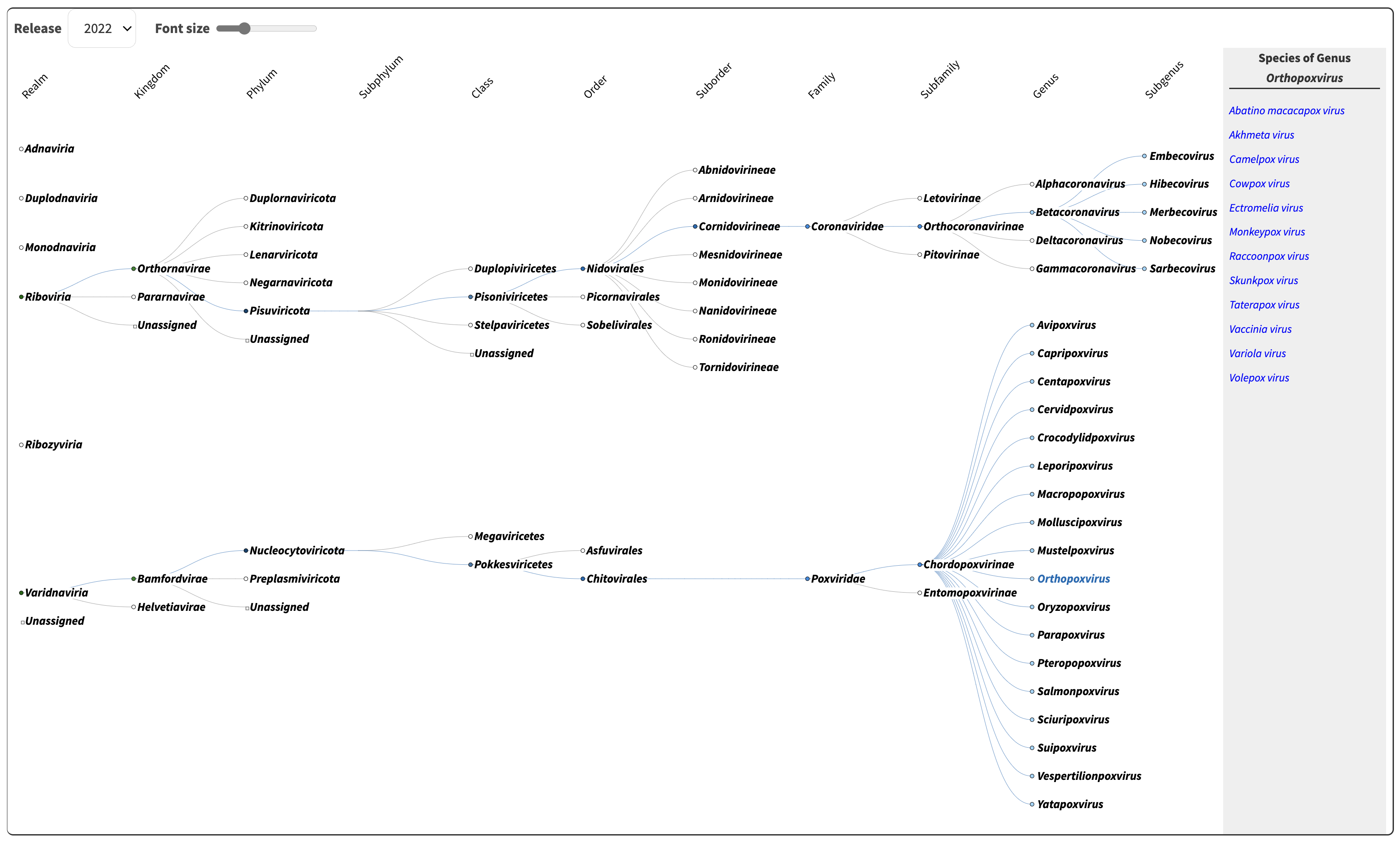The new 2022 ICTV taxonomy is now available in both our traditional tabular browser: https://ictv.global/taxonomy and also in our new Visual Taxonomy browser: https://ictv.global/taxonomy/visual-browser . This is the first release of the visual browser, and we welcome your feedback on bugs, what works well, what needs improvement, and new features. Please send comments to help@ictv.global.