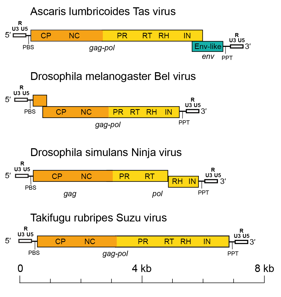 Figure 1. Belpaoviridae.   Full-length genome architectures of representative semotiviruses. LTRs, including the U3, R and U5 regions, and the distinct gag, pol, and env regions are differentially colored. The LTRs are white, gag is orange, pol is yellow and env is green. Abbreviations: LTR, long terminal repeats; PBS, primer-binding site; PPT, polypurine tract; CP, capsid protein domain; NC, nucleocapsid protein domain; PR, protease; RT, reverse transcriptase; RH, ribonuclease H; INT, integrase; and Env-like, envelope-like protein.