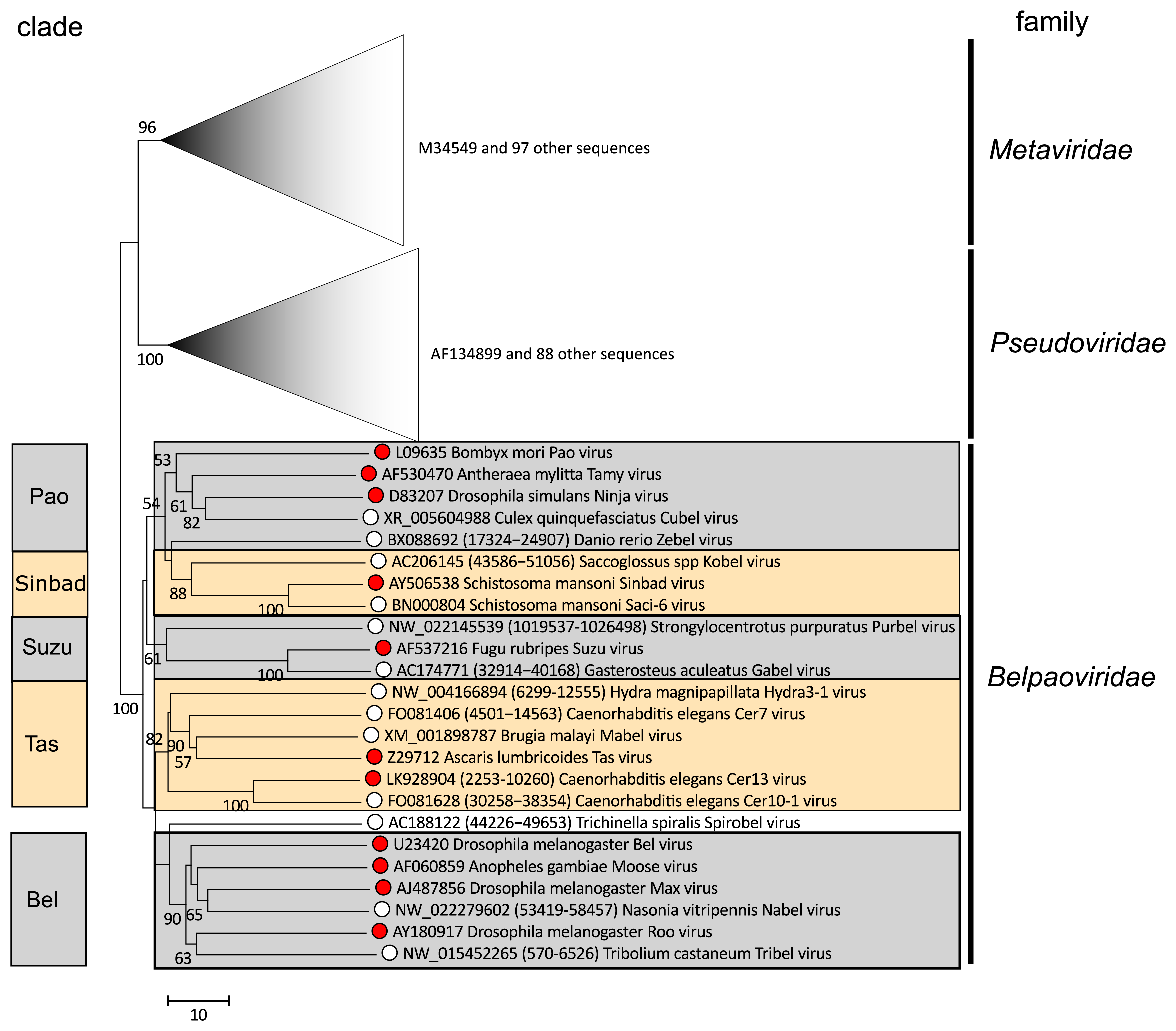 Figure 2. Belpaoviridae Phylogenetic tree of the Belpaoviridae family based on the alignment of the RT core of 210 operational taxonomic units (OTUs) belonging to the Metaviridae, Pseudoviridae and Belpaoviridae families. ClustalW (Larkin et al., 2007) and GeneDoc (https://genedoc.software.informer.com/2.7) were used to align and manually refine the sequences. Clustal W was also used to perform the phylogenetic reconstruction analysis using the neighbor-joining method and 1000 bootstrap replicates (values >50% shown). The branches corresponding to the Metaviridae and Pseudoviridae families are collapsed and used to root the tree. Red spots indicate members of Belpaoviridae species; open circles indicate potential members, corresponding to the set of non-redundant canonical belpaovirids retrieved from the GyDB, are summarized in the section Related, unclassified viruses. This phylogenetic tree and corresponding sequence alignment are available to download from the Resources page.