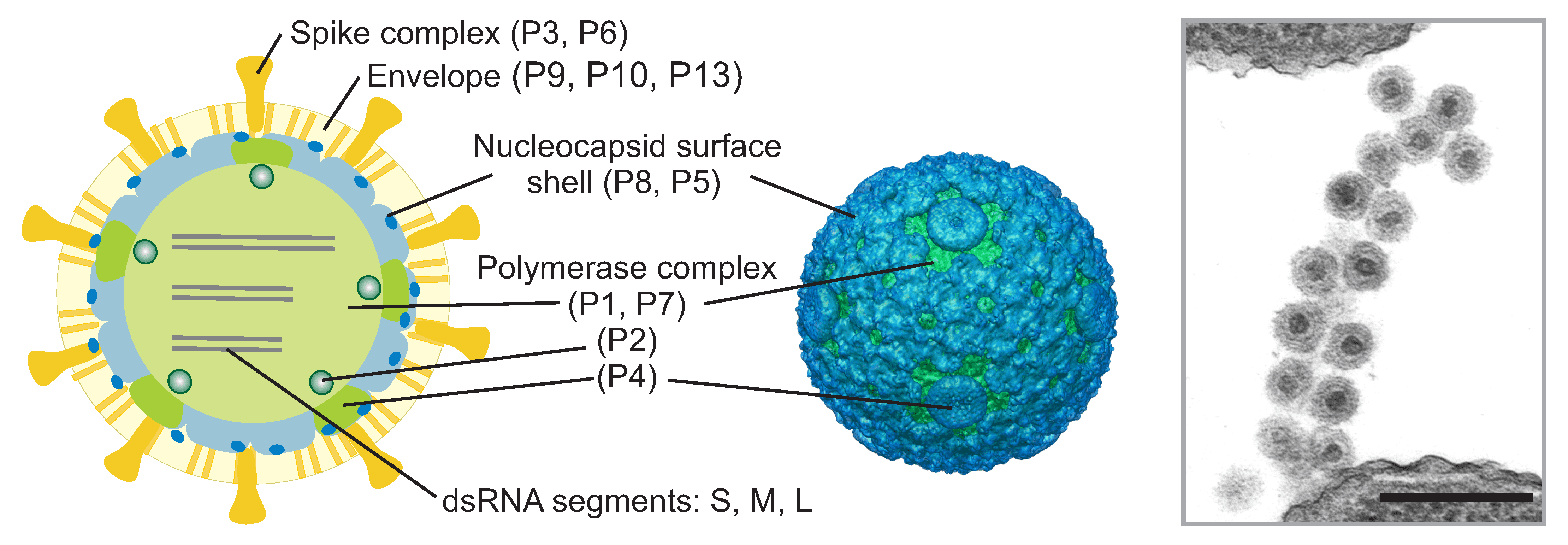 Figure 1. Cystoviridae.  Schematic presentation of a cystovirus particle (Pseudomonas phage phi6) with the location of virion proteins (left). Three-dimensional reconstructions of the nucleocapsid (middle). Thin-section electron micrograph of Pseudomonas phage phi6 particles attached to the pilus receptor of the host (right). The bar represents 200 nm.