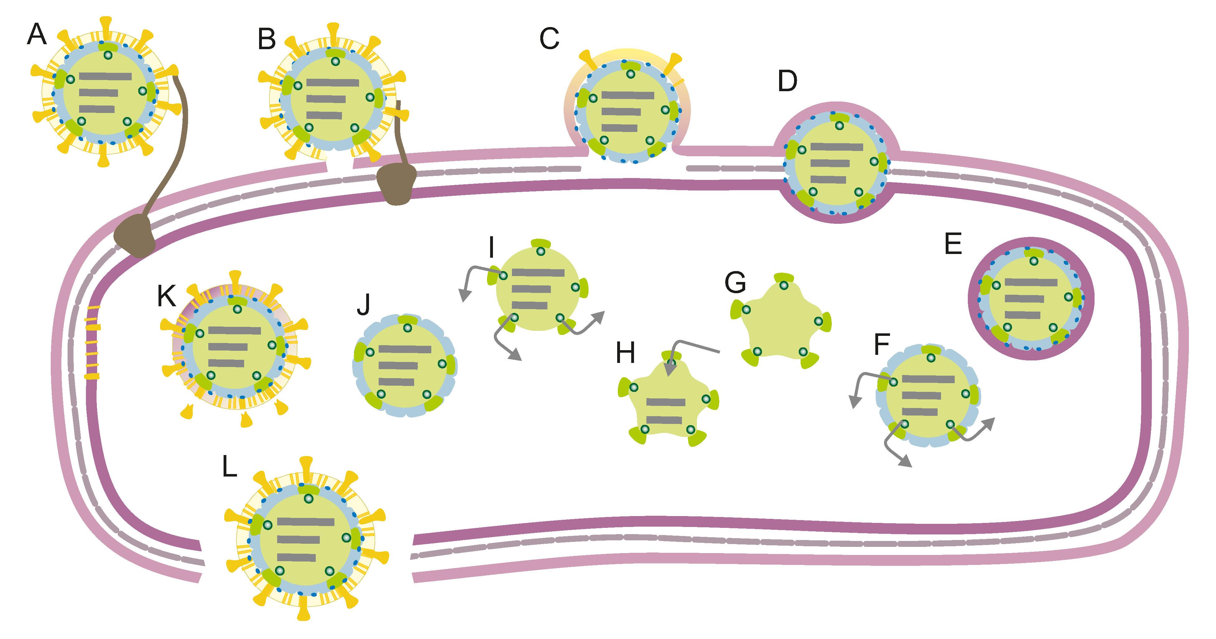 Figure 3. .Cystoviridae.  Schematic presentation of the Pseudomonas phage phi6 life cycle. (A) Adsorption. (B) Envelope fusion. (C) Peptidoglycan digestion. (D–E) Endocytotic uptake of the nucleocapsid. (F) Early transcription. (G) Polymerase complex assembly. (H) ssRNA packaging and replication. (I) Late transcription. (J) Nucleocapsid shell assembly. (K) Translocation of the viral envelope and assembly of spikes. (L) Host cell lysis and release of mature virions.