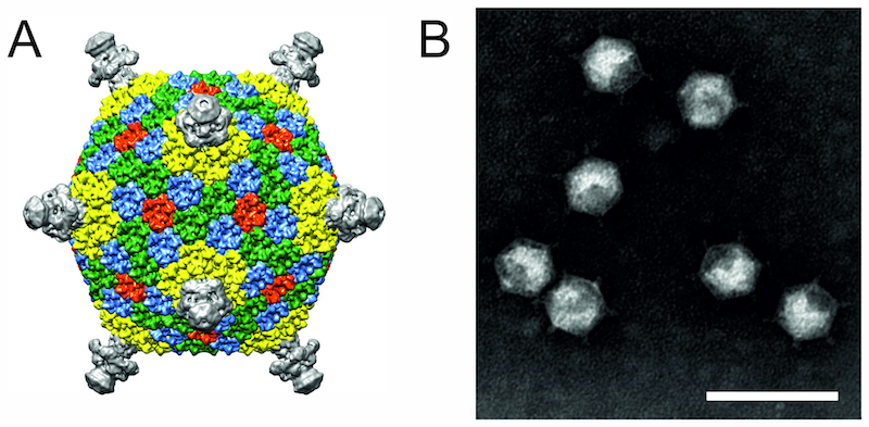 Figure 1. Finnlakeviridae (A) Cryo-electron microscopic reconstruction of the Flavobacterium phage FLiP virion (Laanto et al., 2017). (B) Flavobacterium phage FLiP virions negatively-stained with 2% phosphotungstic acid (pH 8.5) and visualized under transmission electron microscopy. Scale bar represents 100 nm.