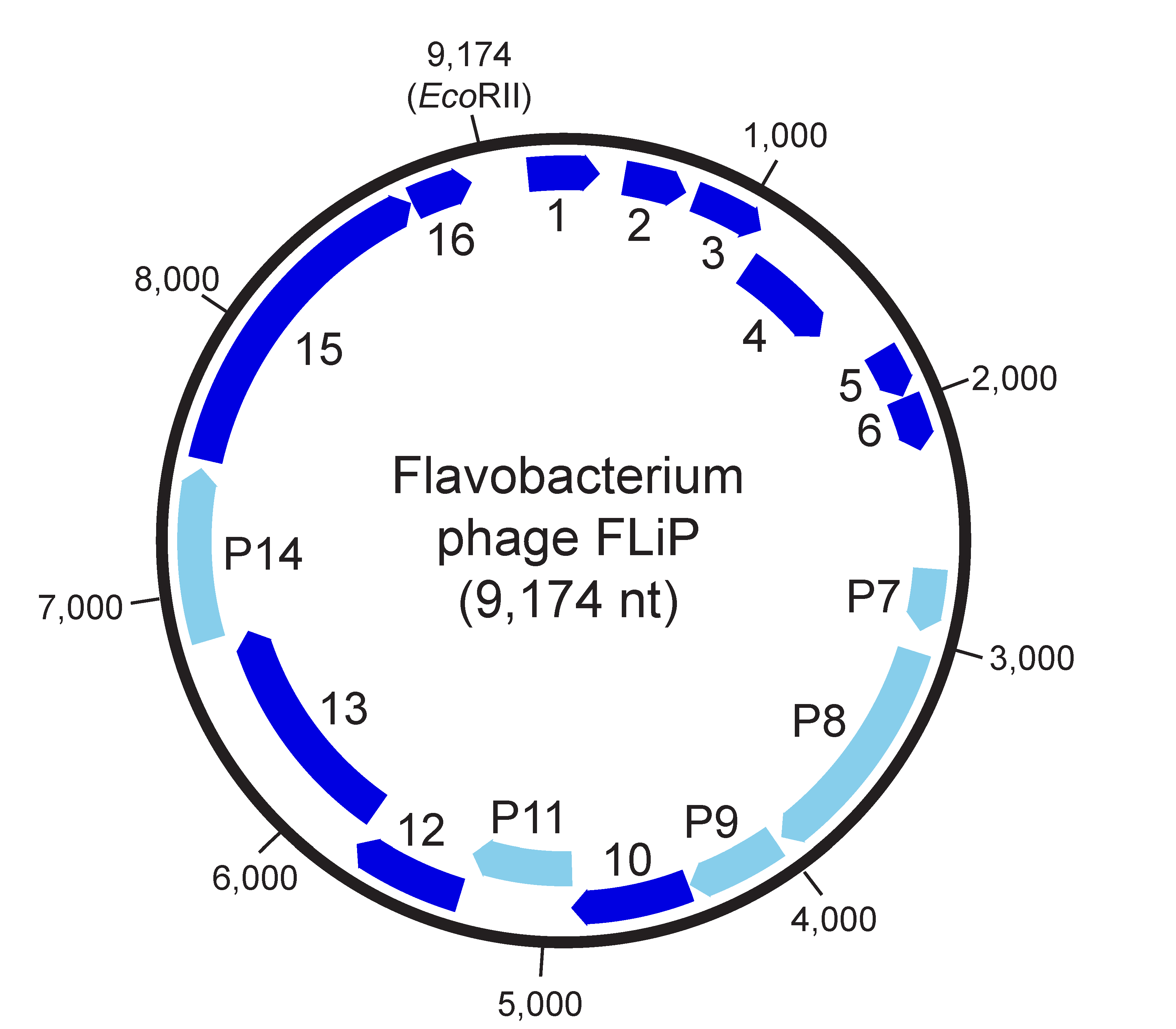 Figure 2. Finnlakeviridae.  Genome organization of Flavobacterium phage FLiP. Nucleotide numbering starts from a unique EcoRII restriction site. Sixteen predicted coding sequences are marked with arrows indicating the direction of transcription. CDS encoding structural proteins are indicated by light blue colour and labelled with the protein they encode.