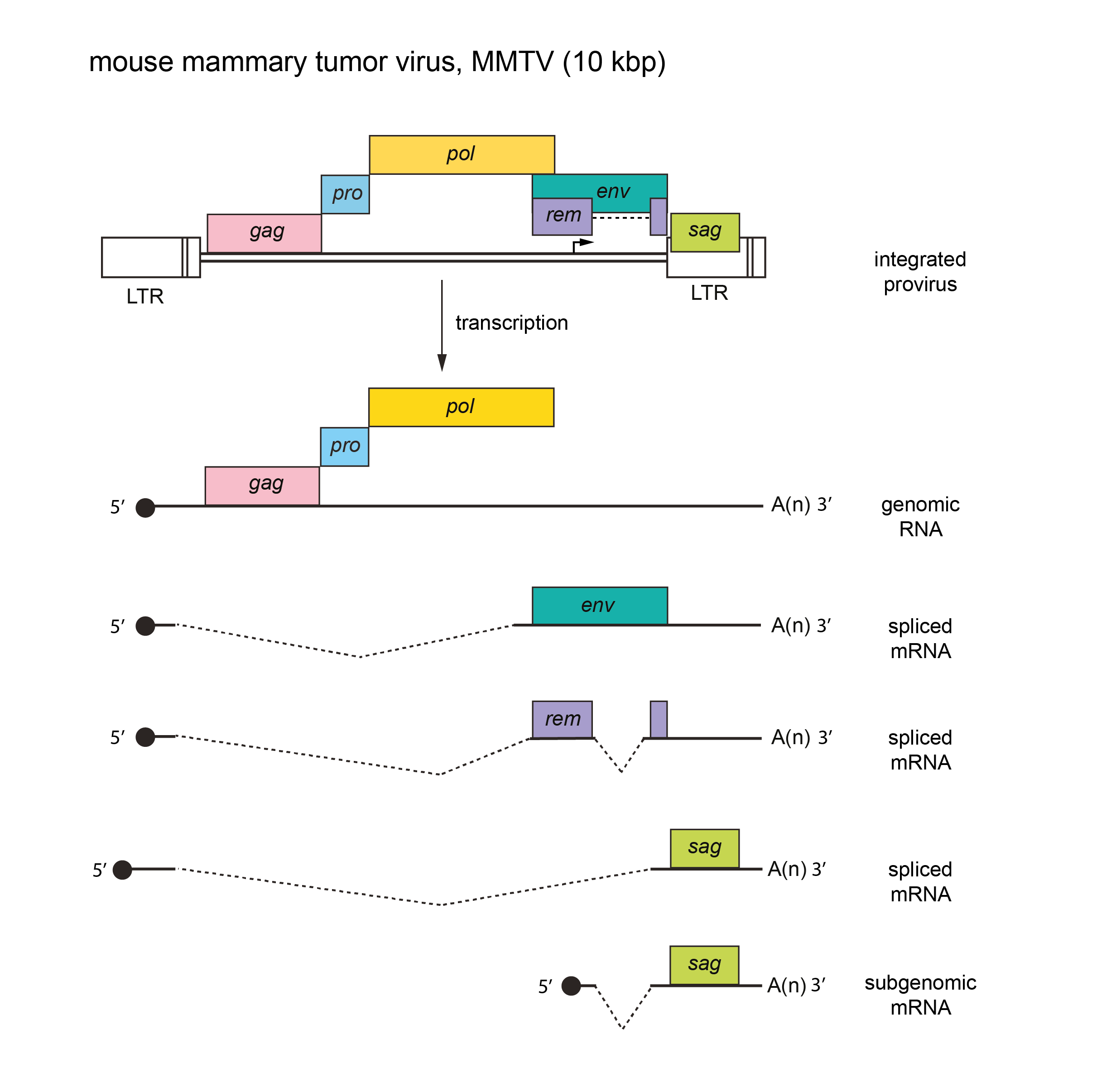 Virions can have “B-type” or “D-type” morphology, depending on the species. Genomes typically contain an additional regulatory gene that overlaps with the env gene and is encoded by a multiply-spliced mRNA – examples include the rem gene of MMTV and the rej gene of JSRV.
