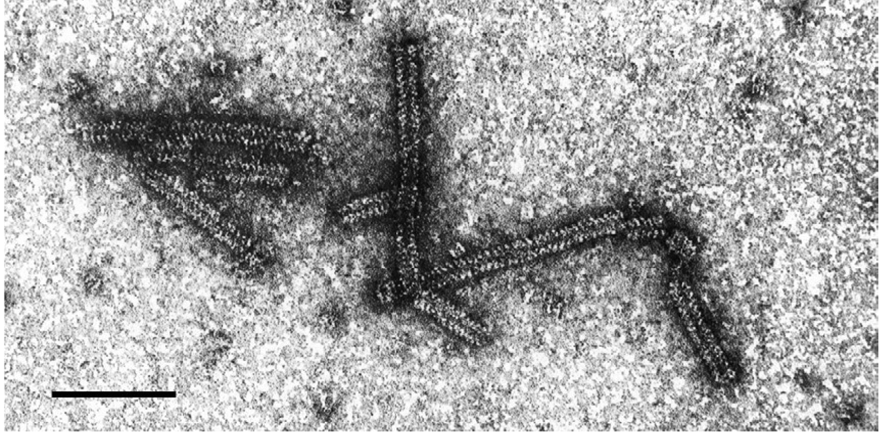 | Figure 1 Varicosavirus. Negative-contrast electron micrograph of virions of an isolate of lettuce big vein-associated virus. The bar represents 100 nm (Courtesy J.A. Walsh and C.M. Clay.) |