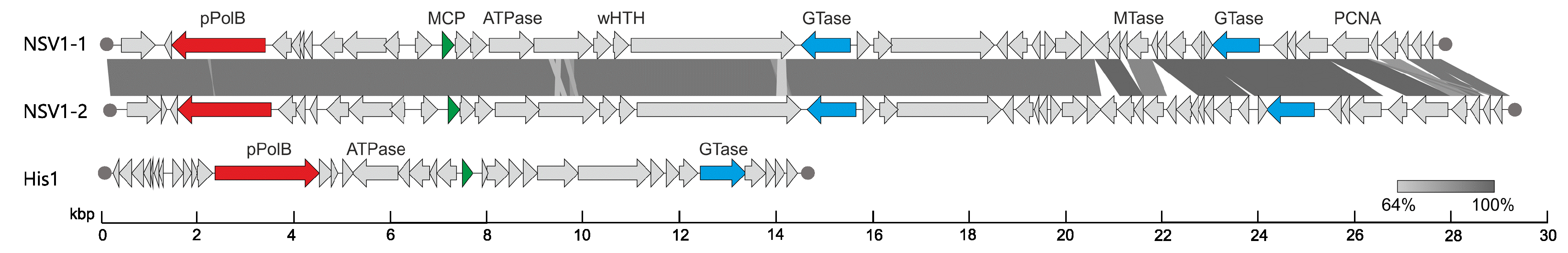 | Figure 2. Thaspiviridae. Genome maps of Nitrosopumilus spindle-shaped virus 1 isolates NSV1-1 and NSV1-2, and of the haloarchaeal halspivirus His1. Shared ORFs are connected by shaded areas based on sequence identity. Functionally equivalent (but not necessarily homologous) genes are indicated with matching colors. Filled circles indicate terminal inverted repeats. Abbreviations: pPolB, protein-primed family B DNA polymerase; MCP, major capsid protein (putative); wHTH, winged helix-turn-helix; GTase, glycosyltransferase; MTase, DNA methyltransferase; PCNA, proliferating cell nuclear antigen. |