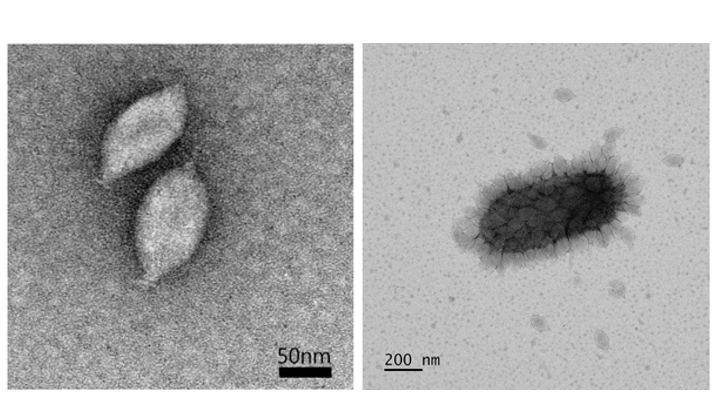 | Figure 1. Thaspiviridae. (left) Transmission electron micrograph of negatively-stained virions of Nitrosopumilus spindle-shaped virus 1. Scale bar: 50 nm. (right) Virus particles attached to the surface of a host cell. Scale bar, 200 nm |