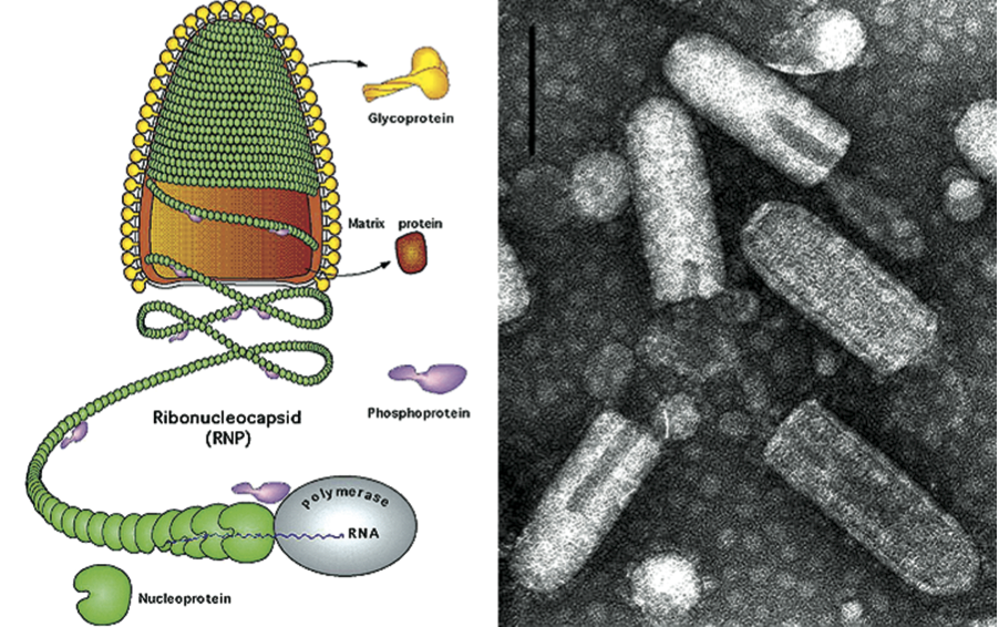 Virions are enveloped and bullet-shaped. Their three-dimensional structures have been recently determined utilizing cryo-electron microscopy (Figure 4). The nucleocapsid forms a conical-shaped tip and a helical structure in the trunk. Each virion contains an outer helix of matrix protein M and an inner helix of N protein and RNA. M has a hub domain with four contact sites which link to neighboring M and N subunits, providing rigidity by clamping adjacent turns of the RNP. Interactions among the N and M proteins provide scaffolding and stability to the complex and are critical in maintaining the bullet shape. Two layers of lipids obtained from the host cell membrane with embedded trimers of the envelope glycoprotein (G) form the outer layers of the virion and mediate the interaction with cellular receptor(s).