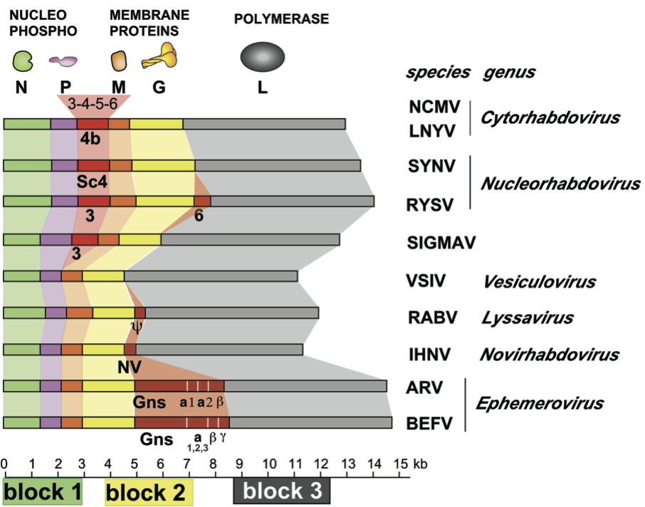 Figure 2 Comparison of genome organization of representative members from all genera of the family Rhabdoviridae. A modular organization into three blocks has been conserved: the 3 block #1 encodes N/P proteins required in large amounts; the central block #2 encodes the membrane M/G proteins; the 5 block #3 encodes the polymerase L required in limited amounts. Between blocks, viruses have inserted typical genes adapted to their particular biology, for example the movement protein (3, 4b) in plant rhabdoviruses.