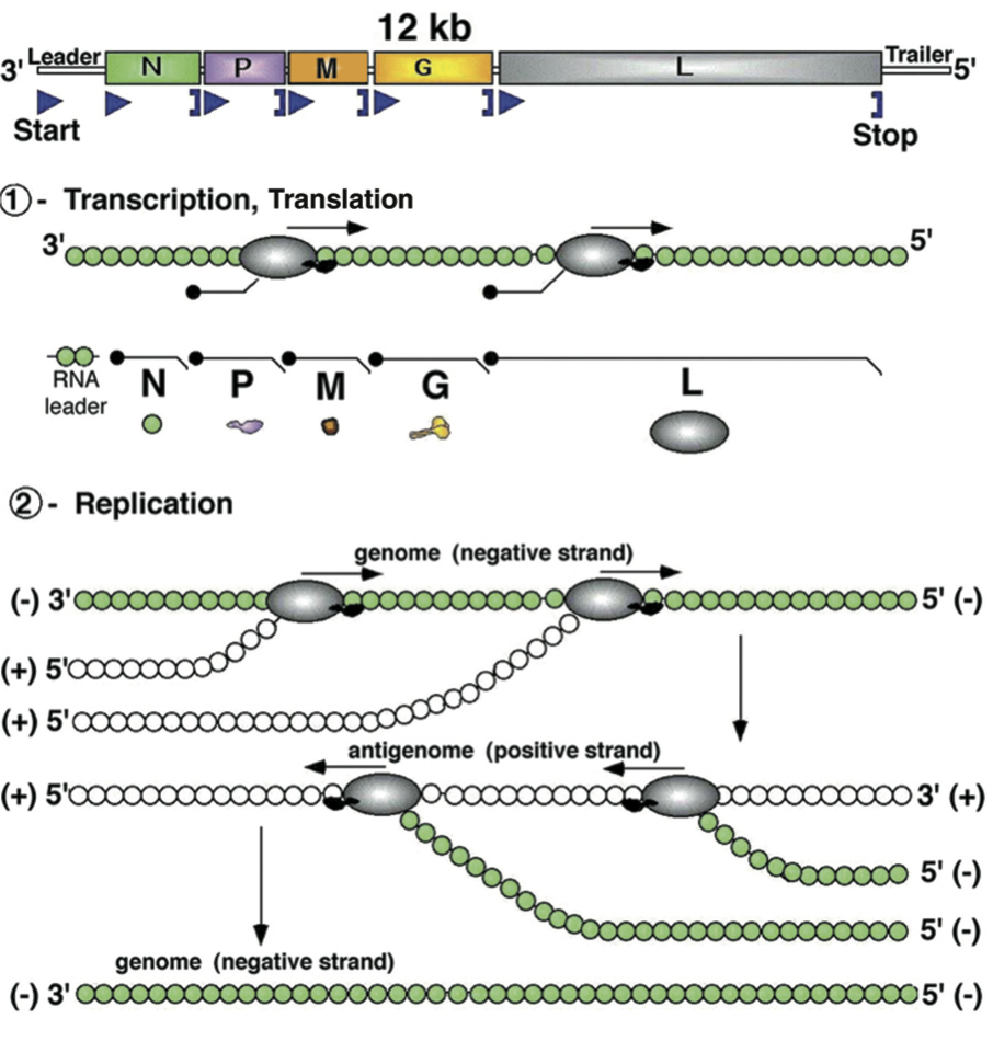 Figure 3 Panel (1) shows the genome organization of vesicular stomatitis Indiana virus (VSIV) and the process of consecutive transcription of leader RNA and monocistronic mRNAs. Panel (2) illustrates the replication of the negative sense genome via a positive sense antigenome intermediate. The switch from transcription to replication appears to be regulated by the N protein.
