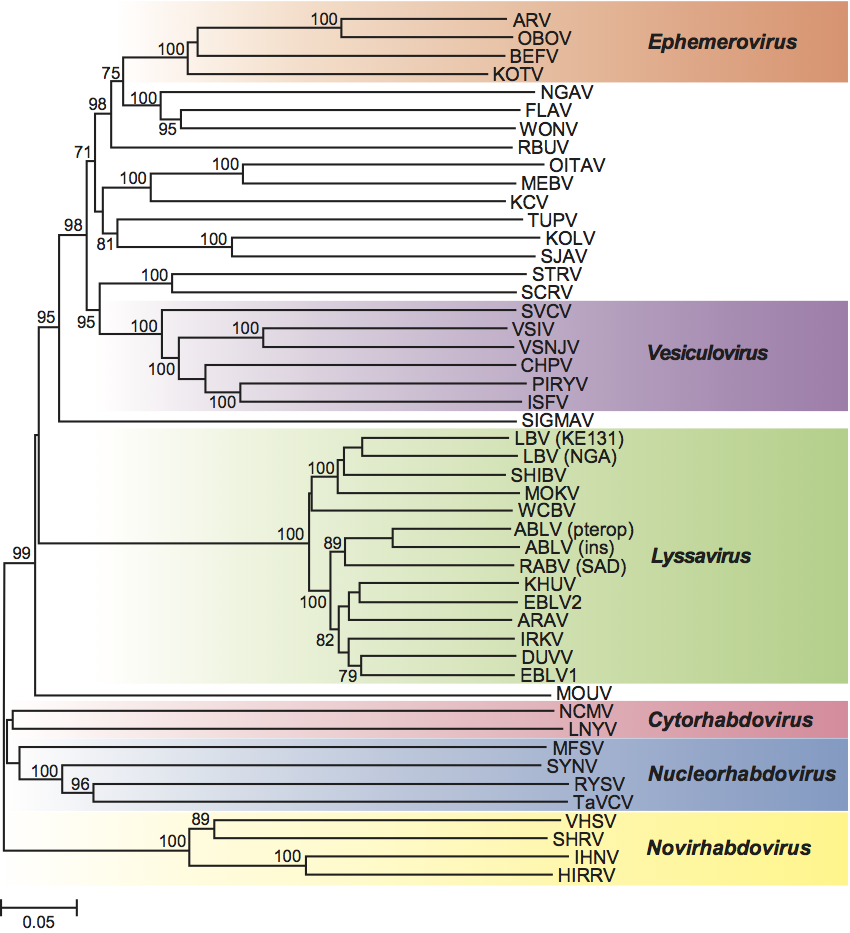 Molecular phylogenies determined by using N, G, or L protein sequences suggest a monophyletic origin and support the assignment of the six established genera and the species within these genera. For P and G proteins, relatively low sequence identities across the family prevent the construction of a universal phylogeny. N and L protein sequences are most highly conserved (see Figure 6). Both phylogenetic analyses indicate that vesiculoviruses and ephemeroviruses are the most closely related of the established genera and together with some currently non-classified viruses may be considered as members of a phylogenetic supergroup named “Dimarhabdovirus” (dipteran-mammal associated rhabdovirus).