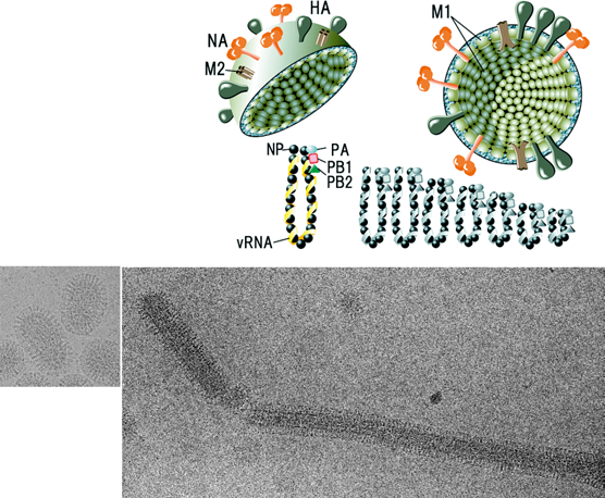 Figure 1 (Top) Diagram of an influenza A virus (FLUA) virion in section. The indicated glycoproteins embedded in the lipid membrane are the trimeric hemagglutinin (HA), which predominates, and the tetrameric neuraminidase (NA). The envelope also contains a small number of M2 ion channel proteins. The internal components are the M1 (matrix) protein and the viral ribonucleoprotein (RNP) consisting of RNA segments, associated nucleocapsid protein (NP), and the PA, PB1 and PB2 polymerase proteins. NS2 (NEP), also a virion protein, is not shown. (Bottom) Frozen-hydrated images of a spherical A/Aichi/2/68 X-31 virion (left) and a filamentous A/Udorn/72 virion (right)