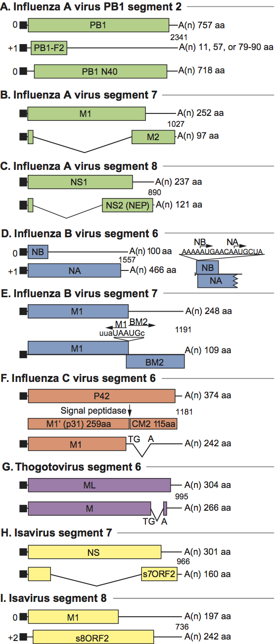 Figure 2 Orthomyxovirus genome organization. The genomic organization and ORFs are shown for genes that encode multiple proteins. Segments encoding the polymerase, hemagglutinin and nucleoprotein genes are not depicted as each encodes a single protein. (A) Influenza A virus PB1 segment ORFs. Initiation of PB1 translation is thought to be relatively inefficient based on Kozaks rule, likely allowing initiation of PB1-F2 translation by ribosomal scanning and results in PB1-F2 proteins of different size. In addition, the use of a second AUG, present in many but not all viruses, in frame in the PB1 ORF as the initiation codon encodes the polypeptide PB1 N40, the C terminal 718 amino acids of PB1. (B) Influenza A virus segment 7 showing M1 and M2 mRNAs and their coding regions. M1 and M2 share 9 amino-terminal residues, including the initiating methionine; however, the ORF of M2 mRNA (nt 7401004) differs from that of M1. (C) Influenza A virus segment 8 showing NS1 and NS2 (NEP) mRNAs and their coding regions. NS1 and NS2 (NEP) share 10 amino-terminal residues, including the initiating methionine. The ORF of NS2 (NEP) mRNA (nt 529-861) differs from that of NS1. (D) ORFs in Influenza B virus RNA segment 6, illustrating the overlapping reading frames of NB and NA. Nucleotide sequence surrounding the 2 AUG initiation codons, in the mRNA sense, is shown. (E) Influenza B virus RNA segment 7 ORFs and the organization of the ORFs used to translate the M1 and BM2 proteins. A stopstart pentanucleotide, thought to couple translation between the two ORFs, is illustrated. (F) Influenza C virus mRNAs derived from RNA segment 6. The unspliced and spliced mRNAs encode P42 and M1, respectively. The cleavage of P42 by a signal peptidase produces M1(p31) and CM2. (G) Thogoto virus segment 6 showing M and ML. M is translated from a spliced mRNA with a stop codon that is generated by the splicing process itself, as in Influenza C virus M1 mRNA. ML is translated from the unspliced transcript and represents an elongated form of M with a C-terminal extension of 38 aa. (H) Isavirus mRNAs derived from segment 7. The unspliced mRNA encodes the NS protein and the spliced mRNA encodes a polypeptide of unknown function. (I) Isavirus mRNAs derived from segment 8. ORF1 starts at nucleotide 22 and encodes the M1 protein, ORF2 starts at nucleotide 36, in the+2 reading frame relative to ORF1 and encodes a polypeptide of unknown function. For all panels, the boxes represent different coding regions. Introns in the mRNAs are shown by the V-shaped lines; filled rectangles at the 5 ends of mRNAs represent heterogeneous nucleotides derived from cellular RNAs that are covalently linked to viral sequences. Lines at the 5 and 3 termini of the mRNAs represent untranslated regions.