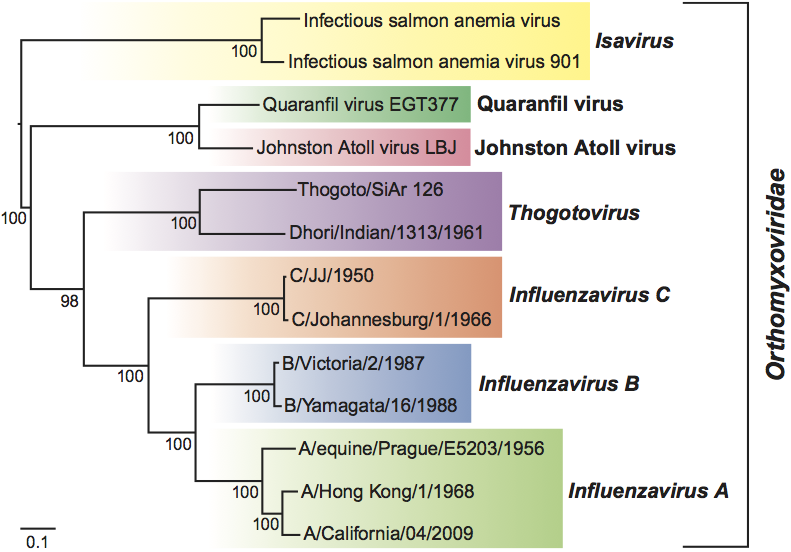 Figure 3 Phylogenetic relationships within the family Orthomyxoviridae. Nucleotide sequences of the polymerase basic 1 proteins (PB1) were aligned using transAlign and CLUSTAL W, and their phylogenetic relationships were determined by the neighbor-joining method (HKY model) using PAUP* (version 4.0b). The tree was mid-point rooted and bootstrap values (1000 replicates) are indicated on the branches. The GenBank accession numbers for the sequences used for comparison were (top to bottom) AF404346, GU830904, FJ861695, FJ861697, AF004985, M65866, M28060, AF170575, CY018763, CY018771, GU053121, CY044267 and FJ966080.