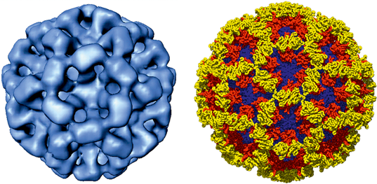Figure 1 The structure of the calicivirus capsid exemplified by cryo-image reconstruction of recombinant Norwalk virus (NV)-like particles (rNV VLPs) (Left). X-ray structure of the Norwalk virus capsid (Right) with the Shell, Protruding 1, and Protruding 2 domains colored in blue, red and yellow, respectively.