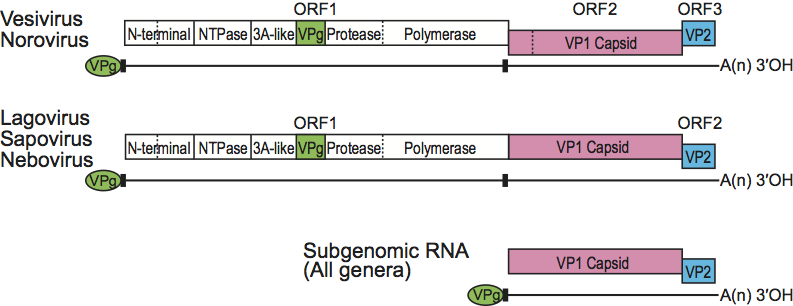 Caliciviruses have single stranded, positive sense genomic RNA (positive-strand RNA) organized into either two or three major ORFs (see genus descriptions). The non-structural proteins are encoded in the 5′-terminus of the genome and the structural proteins in the 3′-terminus (Figure 2). Replication occurs in the cytoplasm and two major positive-strand RNA species are found in infected cells: (1) the genome-sized, positive-strand RNA serves as the template for translation of a large polyprotein that undergoes cleavage by a virus-encoded protease to form the mature non-structural proteins and (2) a subgenomic-sized, positive-strand RNA, co-terminal with the 3′- terminus of the genome is the template for translation of the VP1 as well as the 3′-terminal ORF product VP2. A dsRNA corresponding in size to full-length genomic RNA has been identified in FCV and San Miguel sea lion virus (SMSV)-infected cells, indicating that replication occurs via a negative-strand intermediate.