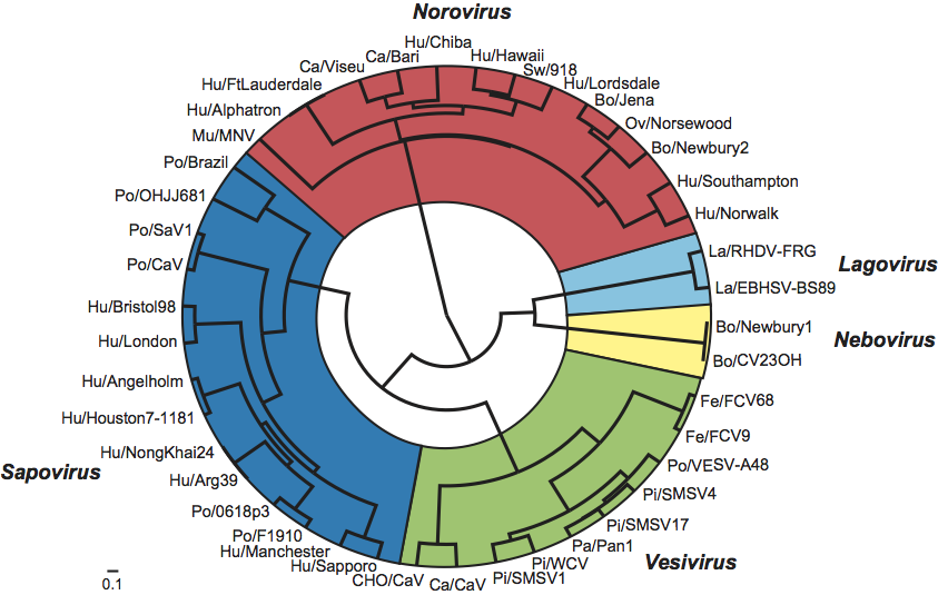 Figure 3 Phylogenetic relationships in the family Caliciviridae. The noroviruses are highlighted in red, lagoviruses in light blue, neboviruses in yellow, vesiviruses in green and sapoviruses in blue. Two prototype viruses were included to represent each genogroup, For some genera, additional strains were included to demonstrate circulation in different species (e.g., Po/Sw917 in norovirus GII). Genera are defined by amino acid p-distance of up to 0.7, genera cut-offs were expanded to include all representative genogroups within a genus. The amino acids of full length VP1 capsid sequences were aligned in SeaView 4.2 using MUSCLE with a gap cost of 5 and neighbor-joining clustering method for the 1st and 2nd iterations. Bayesian phylogenetic analysis was run on BEAST without a molecular clock for 106 iterations using the WAG amino acid substitution and Yule speciation tree model. Parameters and length of the run was verified by using Tracer, part of the BEAST suite of programs. All genera are supported by posterior distribution value of 1.0 (100% of sampled trees). The scale bar represents amino acid substitutions per site.