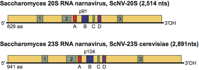 Figure 1 Genomic organization of Saccharomyces 20S RNA narnavirus (ScNV-20S) and Saccharomyces 23S RNA narnavirus (ScNV-23S) and the proteins encoded on them (p91 and p104, respectively). Sequence motifs (A to D) conserved in RdRp are boxed and shaded. Motifs 1, 2 and 3 are present only in p91 and p104.