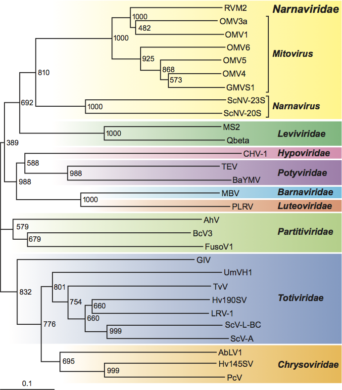 Figure 2 Phylogenetic tree based on aa sequences of motifs A to E (Hong et al. 1998) of the putative RdRp proteins of members of the family Narnaviridae, other families of RNA viruses of fungi and related viruses in other host taxa, and the family Leviviridae of RNA bacteriophages. Sequence alignments and the neighbor-joining tree were made using the Clustal X program. Bootstrap numbers (1000 replicates) are shown on the nodes. Abbreviations and sequence acquisition numbers are: AbVL1, Agaricus bisporus virus L1 X94361; AhV, Atkinsonella hypoxylon virus L39126; BaYMV, Barley yellow mosaic virus D01091; BcV3, Beet cryptic virus 3 S63913; CHV1, Cryphonectria hypovirus 1 M57938; CMV1, Cryphonectria mitovirus 1 L31849; FusoV1, Fusarium solani virus 1 D55668; GlV, Giardia lamblia virus L13218; GMVS1, Gremmeniella mitovirus S1 AF534641; Hv145SV, Helminthosporium victoriae 145S virus AF297176; Hv190SV, Helminthosporium victoriae 190S virus U41345; LRV1, Leishmania RNA virus 1-1 M92355; MBV, Mushroom bacilliform virus U07551; MS2, Enterobacteria phage MS2 GB-PH:MS2CG; OMV3a, Ophiostoma mitovirus 3a AJ004930; OMV4, Ophiostoma mitovirus 4 AJ132754; OMV5, Ophiostoma mitovirus 5 AJ132755; OMV6, Ophiostoma mitovirus 6 AJ132756; PcV, Penicillium chrysogenum virus AF296439; PLRV, Potato leafroll virus X14600; Qbeta, Enterobacteria phage Q AY099114; RVM2, Rhizoctonia virus M2 U51331; ScV-L-A, Saccharomyces cerevisiae virus L-A J04692; ScV-L-BC, Saccharomyces cerevisiae virus L-BC U01060; ScNV-20S, Saccharomyces 20S RNA narnavirus M63893; ScNV-23S, Saccharomyces 23S RNA narnavirus M86595; TEV, Tobacco etch virus M15239; TvV, Trichomonas vaginalis virus U08999; UmVH1, Ustilago maydis virus H1 U01059.