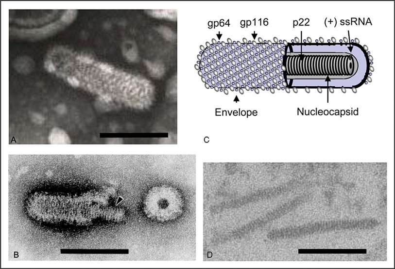 Virions are enveloped, bacilliform in shape with rounded ends, and 40–60 nm ×150–200 nm in dimensions (Figure 1). The envelope is studded with prominent peplomers projecting approximately 11 nm from the surface. Nucleocapsids are 20–30 nm in diameter and have a helical symmetry with coil periodicity of 5–7 nm. Long filamentous nucleocapsid precursors (approximately 15 nm in diameter and 80–450 nm in length) occur in the cytoplasm of infected cells and acquire envelopes by budding at endoplasmic reticulum membranes. Newly budded mature enveloped virions often appear as multimers butted end-to-end and paracrystalline arrays of virions can occur within vesicles.