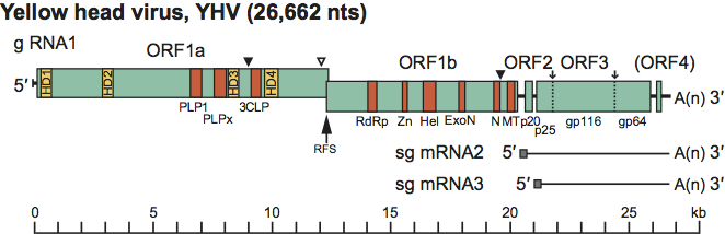 Virions contain a single linear segment of positive sense ssRNA varying in length from 26,235 nt for gill-associated virus (GAV) to 26,662 nt for YHV. The genome contains a 5′-terminal 7-methylguanosine cap and a 3′-polyadenylated tail.