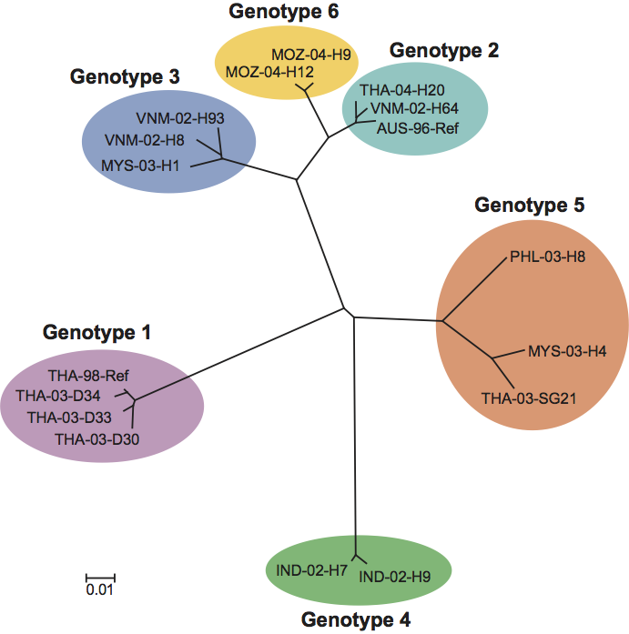 Phylogenetic analyses of a partial ORF1b gene sequence has clustered okaviruses into six distinct genotypes numbered 1 (YHV), 2 (GAV), 3, 4, 5 and 6 (Figure 3). Genotype 1, 2, 3 and 5 viruses have been detected in P. monodon from various locations in Southeast Asia, but genotypes 2, 4 and 6 are the sole genotypes thus far detected in P. monodon from Australia, India and eastern Africa, respectively. There is evidence of naturally occurring genetic recombination involving genotypes 1 (YHV), 2 (GAV), 3 and 5.