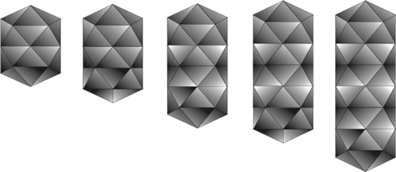 Figure 1 Diagram of virion surface of a member of the genus Ourmiavirus, showing arrangement of double disks and conical ends in particles of different length. Each row of five triangles represents a double disk.