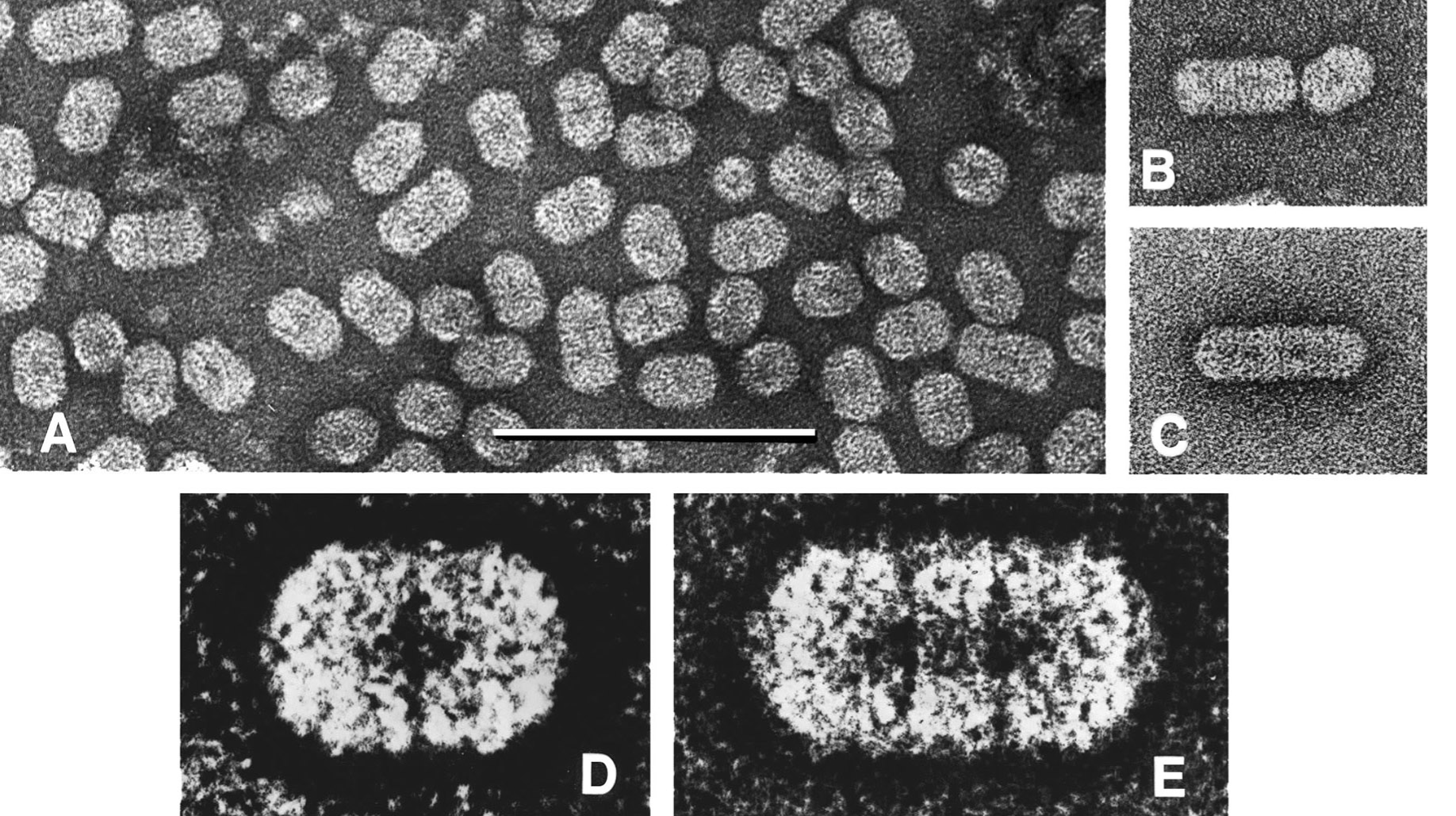 The bacilliform virions constitute a series of particles with conical ends (apparently hemi-icosahedra) and cylindrical bodies 18 nm in diameter. The bodies of the particles are composed of a series of double disks, the commonest particle having two disks (particle length 30 nm), a second common particle having three disks (particle length 37 nm) with rarer particles having four disks (particle length 45.5 nm) and six disks (particle length 62 nm). There is no envelope. (See Figures 1 and 2.)