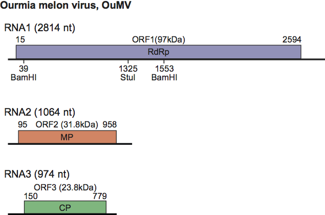 Figure 3 Diagram of the genome organization of Ourmia melon virus isolate VE9 showing the size of each RNA and the positions and sizes of the ORFs. CP, coat protein; MP, movement protein; RdRp, RNA-dependent RNA polymerase.