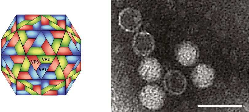 Figure 1 (Left) Diagrammatic representation of the possible structure of Heterosigma akashiwo RNA virus (HaRNAV) particles. (Right) Electron micrograph of HaRNAV particles stained with phosphotungstic acid. The bar represents 50 nm.