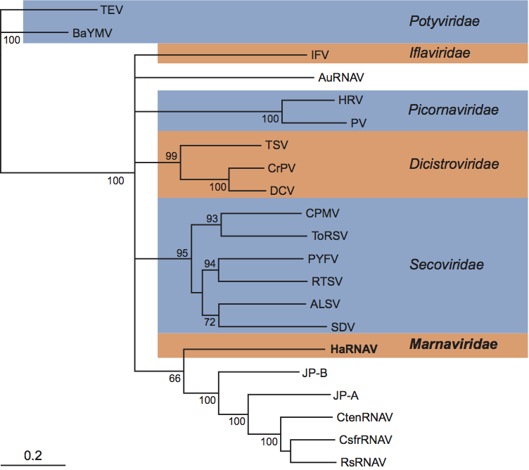 Figure 3 Bayesian maximum likelihood phylogenetic tree of RdRp sequences from the order Picornavirales. Residues 13621619 of the HaRNAV polyprotein that represent the conserved regions I-VIII and the corresponding regions from the other viruses included were aligned with DIALIGN-TX. Amino acid alignments were transformed into likelihood distances with Mr Bayes v3.1.2 using 1,100,000 generations. Bayesian clade credibility values are shown for relevant nodes. The Bayesian scale bar indicates a distance of 0.2. Taxonomic groups are indicated where known. TEV, tobacco etch virus; BaYMV, barley yellow mosaic virus; IFV, infectious flacherie virus; AuRNAV, Aurantiochytrium single stranded RNA virus; HRV, human rhinovirus; PV, poliovirus; TSV, taura syndrome virus; CrPV, cricket paralysis virus; DCV, Drosophila C virus; CPMV, cowpea mosaic virus; ToRSV, tomato ringspot virus; PYFV, parsnip yellow fleck virus; RTSV, rice tungro spherical virus; ALSV, apple latent spherical virus; SDV, satsuma dwarf virus; CtenRNAV, Chaetoceros tenuissimus RNA virus; CsfrRNAV, Chaetoceros socialis f. radians RNA virus; RsetRNAV, Rhizosolenia setigera RNA virus. JP-A and JP-B are environmental sequences.