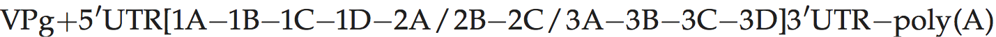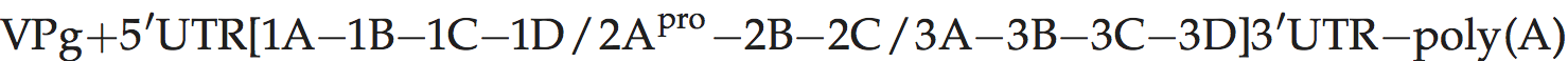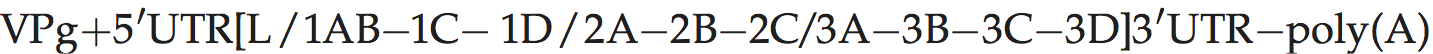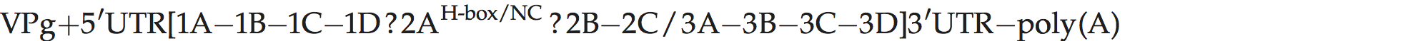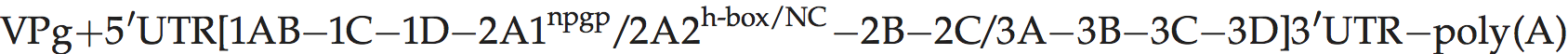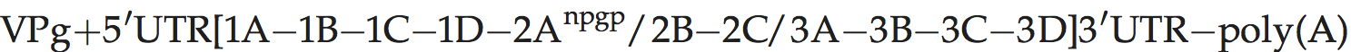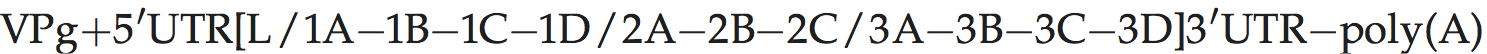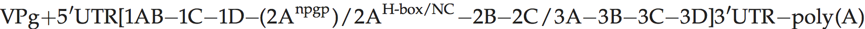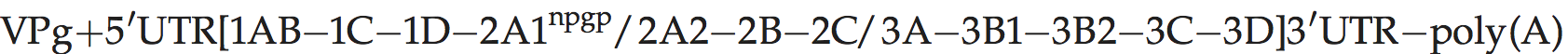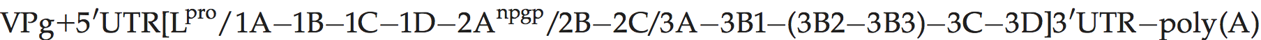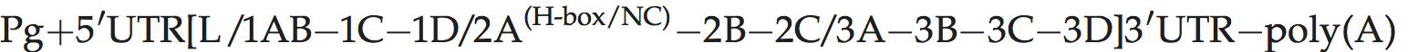 Where “[” and “]” define the extent of the polyprotein-coding region, “/” represents primary cleavages and “−” represents the final cleavages. Where a particular polypeptide is present only in some members of the genus it can be shown between parentheses. This schema can also be used to indicate some protein functions or amino acid motifs where they differ between viruses (e.g. 2Apro or 2Anpgp or 2AH-box/NC). There may be multiple copies of a particular genomic regions in the picornavirus genome, including repeated copies of one particular region (e.g. three 3Bs in the FMDV genome) or different types of a particular region (e.g. two different 2A motifs in Ljungan virus of the genus Parechovirus and three different 2A motifs in the duck hepatitis A virus genome of the genus Avihepatovirus).