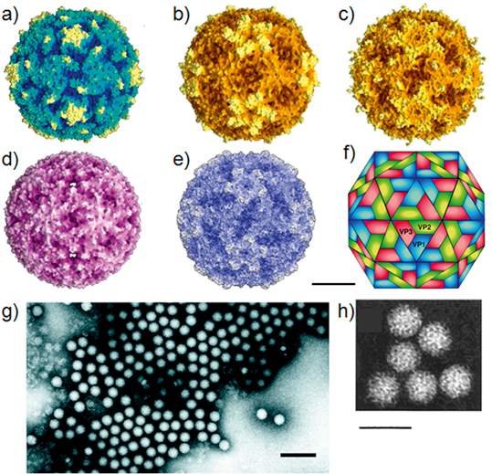 Figure 1 Pictures of picornavirus structures; (a) poliovirus 1 (2PLV); (b) Mengo (2MEV); (c) TMEV (1TME); (d) FMDV O (1FOD); (e) SVV (3CJI); the bar represents 10 nm (images courtesy of Jean-Yves Sgro, with permission). (f) Diagram of a picornavirus particle. The surface shows proteins VP1, VP2 and VP3. The fourth capsid protein, VP4, is located about the internal surface of the pentameric apex of the icosahedron. (g) Negative contrast electron micrograph of poliovirus (PV) particles; the bar represents 100 nm (courtesy of Ann C. Palmenberg). (h) Negative contrast electron micrograph of Aichi virus (genus Kobuvirus) showing surface structure; the bar represents 50 nm