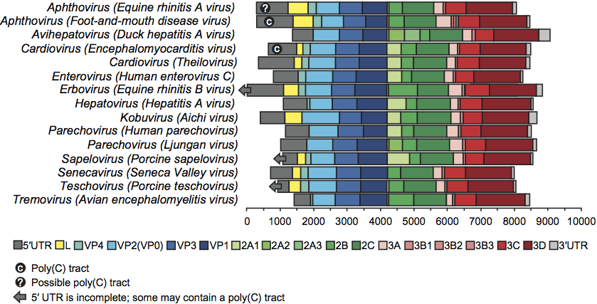 Figure 3 Genome structure and gene organization of members of the family Picornaviridae. Each of the 12 genera is represented, as are species where there is a significant difference within a genus. Circles within the 5 UTR indicate poly(C) tracts that are present in some members. The 1A gene products of many members are myristylated at the amino terminal glycine. The 5 UTR is followed by a long ORF encoding the polyprotein, that is in turn followed by the 3 UTR and a poly(A) tail. The eventual cleavage products of the polyprotein are indicated by vertical lines and different shading. The nomenclature of the polypeptides follows an L:4:3:4 scheme corresponding to the genes (numbers) encoded by the L, P1, P2, P3 regions. The P1 region encodes the structural proteins 1A, 1B, 1C and 1D, also referred to as VP4, VP2, VP3 and VP1, respectively. VP0 (1AB) is the intermediate precursor for VP4 and VP2 and in avihepato-, kobu- and parechoviruses it remains uncleaved. In all viruses 3C is a protease, in enteroviruses 2A is a protease, while in all viruses 3D is considered to be a component of the RNA replicase. Only foot-and-mouth disease virus encodes 3 VPg proteins that map in tandem.