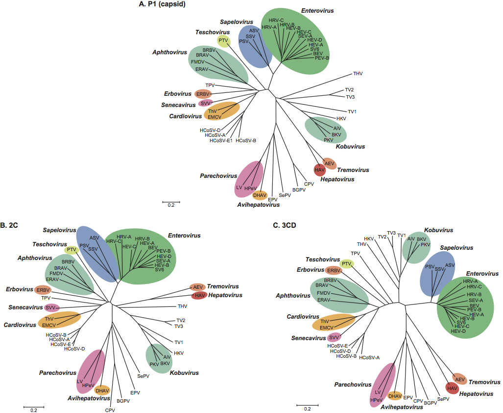 Figure 4 Phylogenetic trees showing the relationships between the genera, species and unclassified members of the family Picornaviridae: (A.P1) protein P1; (B.2C) protein 2C; and (C.3CD) proteins 3C+3D. The neighbor-joining trees were produced using MEGA 4.0 and the poisson model for correction of multiple substitutions. Abbreviations: AEV, Avian encephalomyelitis virus; AiV, Aichi virus; ASV, Avian sapelovirus; BEV, Bovine enterovirus; BGPV, bluegill picornavirus; BKV, Bovine kobuvirus; BRAV, bovine rhinitis A virus; BRBV, Bovine rhinitis B virus; CPV, carp picornavirus; DHAV, Duck hepatitis A virus; EMCV, Encephalomyocarditis virus; EPV, eel picornavirus; ERAV, Equine rhinitis A virus; ERBV, Equine rhinitis B virus; FMDV, Foot-and-mouth disease virus; HAV, Hepatitis A virus; HCoSV, human cosavirus; HEV, human enterovirus; HKV, human klassevirus; HPeV, Human parechovirus; HRV, human rhinovirus; LV, Ljungan virus; PEV-B, Porcine enterovirus B; PKV, porcine kobuvirus; PSV, Porcine sapelovirus; PTV, Porcine teschovirus; SePV, seal picornavirus; SEV-A, Simian enterovirus A; SSV, Simian sapelovirus; SVV, Seneca Valley virus; ThV, Theilovirus; THV, turkey hepatitis virus; TPV, tortoise picornavirus; TV, turdivirus.