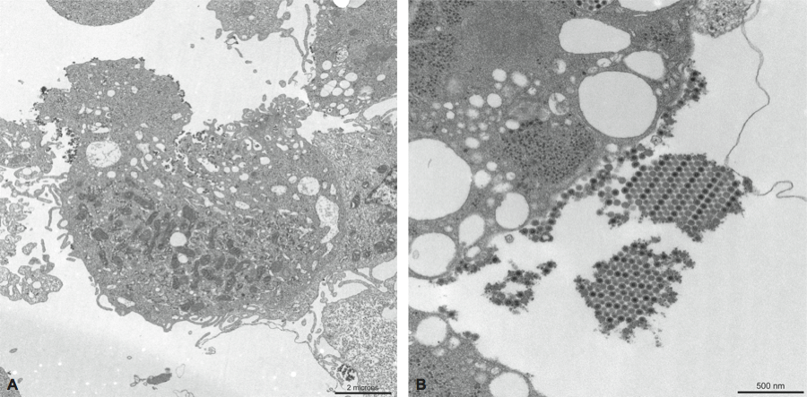 Figure 1 Thin section electron micrographs of Chikungunya virus in Vero E6 cells. Infected cells showed an abundance of viral particles that tended to associate with the plasma membrane.