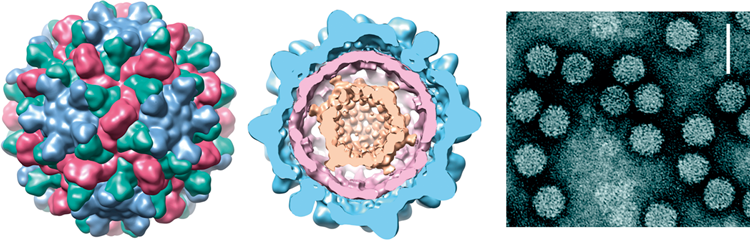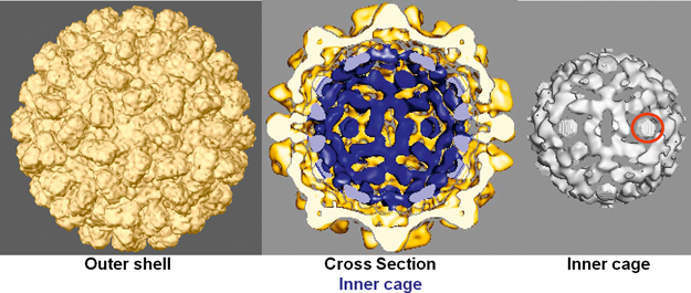 Figure 5 Cryo-EM of the RCNMV particle (from Baker, Sherman and Lommel, with permission; see also Sherman, M.B. et al. (2006). J. Virol., 80, 10395-10406). The RCNMV virion has an ordered internal shell as can be seen by the cross-section of the cryo structure (center panel). In addition to an outer shell (left panel, colored yellow) comprised entirely of coat protein, RCNMV has an additional internal ordered density (colored with shades of blue). Approximately 90% of RCNMVs density corresponds to the coat protein. Thus it is possible that the ordered density observed in the inner cage may correspond in part to ordered RNA.