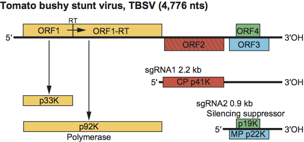 Figure 4 Genome organization and replication strategy of the tombusvirus tomato bushy stunt virus (TBSV). Boxes represent known and predicted ORFs with the sizes of the respective proteins (or readthrough products) shown on the horizontal bars below the ORFs. The yellow-shaded ORFs indicate polymerase proteins that have a high degree of sequence conservation within the family Tombusviridae. Left-hatched box identifies the CP that is conserved among other genera within the family Tombusviridae that have a protruding domain. The blue box shows the MP which shares sequence similarity to the MPs of aureusviruses (see Figure S1). The green box identifies the ORF encoding the silencing suppressor that shares sequence similarity with that of aureusviruses (see Figure S1). Lines underneath depict the two sgRNAs that are synthesized in infected cells. The bars underneath the sgRNAs correspond to the encoded proteins, i.e., the CP, the RNA silencing suppressor and the movement protein (MP). RT=amber termination codon that is read through.