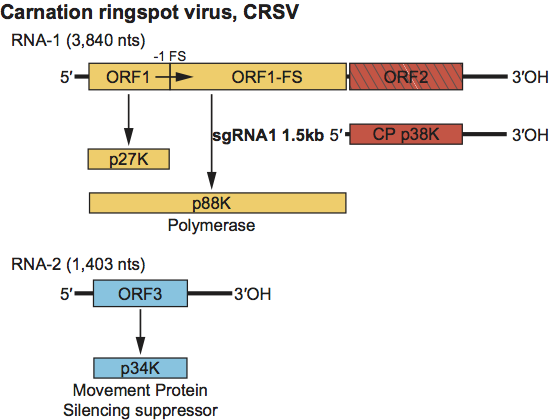 Figure 6 Genome organization and replication strategy of the dianthovirus carnation ringspot virus (CRSV). Boxes represent known ORFs with the sizes of the respective proteins (or readthrough products) indicated in the bars below. Yellow ORFs on RNA1 indicate polymerase proteins that have a high degree of sequence conservation within the family Tombusviridae. Left-hatched box on RNA1 identifies the CP that is conserved among other genera within the family Tombusviridae that have a protruding domain. The blue box on RNA2 identifies the ORF that encodes the MP which is also a silencing suppressor. The MP contains a region of sequence similarity with MPs in the other virus families (see text). The line under RNA1 depicts the 1.5 kb CP sgRNA. 1 FS=site of 1 ribosomal frameshifting.