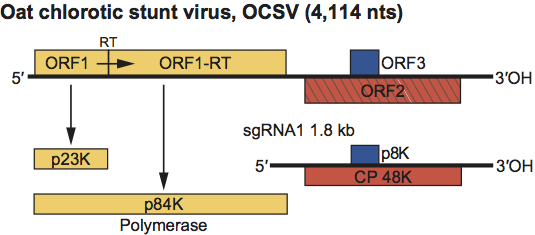Figure 9 Genome organization of the avenavirus oat chlorotic stunt virus (OCSV). Boxes represent known and predicted ORFs with the sizes of the respective proteins (or readthrough products) indicated in the bars below. Yellow ORFs indicate polymerase proteins that have a high degree of sequence conservation within the family Tombusviridae. Left-hatched box identifies the CP that is highly conserved among other genera within the family Tombusviridae that share a protruding domain. The blue box identifies a putative cell-to-cell MP; this protein does not share sequence similarity with any of the other Tombusviridae MPs. RT=termination codon that is read through.