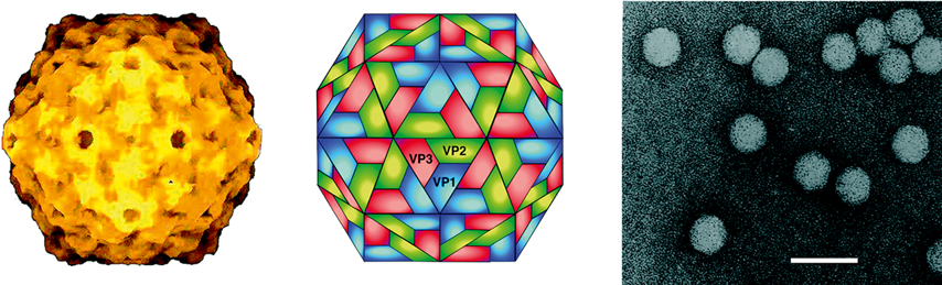 Figure 3 (Left) Cryo reconstruction of the CNV particle showing the P-domain pairs and the five-fold, three-fold and two-fold axes of symmetry. (Center) Cut away image of CNV particle showing features of the structured interior including the inner shell and the connections between it and the outer shell at the particle three-fold axes (cryo images kindly provided by Tom Smith, Donald Danforth Plant Science Centre, St Louis, MO). (Right) Negative contrast electron micrograph of TBSV particles. The bar represents 50 nm.