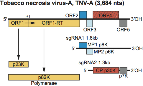 Figure 13 Genome organization and replication strategy of the necrovirus TNV-A. Boxes represent known and predicted ORFs with the sizes of the respective proteins (or readthrough products) indicated in the bars below. Shaded ORFs indicate polymerase proteins that have a high degree of sequence conservation within the family Tombusviridae. Right-hatched box identifies the CP that is highly conserved among other genera within the family Tombusviridae that lack a protruding domain. The dark-blue box identifies one (MP1) of the two proteins involved in cell-to-cell movement that exhibits carboxyl-terminal sequence conservation with similar proteins in the machlomoviruses, carmoviruses, and panicoviruses (see Figure S2). The light-blue box identifies an ORF for a second movement protein (MP2), that shares sequence similarity with the small proteins encoded by viruses in the genera Carmovirus and Panicovirus (see Figure S3). The ORF5 protein does not share sequence similarity with other viral proteins in the family Tombusviridae. Lines underneath the gene map depict the two sgRNAs that are synthesized in infected cells and which allow for the expression of MP1, MP2 and CP. RT=amber termination codon that can be read through.