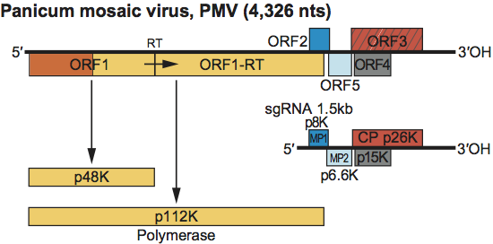 The genomic RNA contains five ORFs (Figure 15). ORF1 encodes a 48 kDa protein. Readthrough of the ORF1 amber termination codon allows the production of a 112 kDa protein. These proteins share sequence similarity with the polymerase proteins of other members of the family (Figure S6). ORF2 encodes an 8 kDa protein that is produced by the 1.5 kb sgRNA. p8 is required for cell-to-cell movement and shows sequence similarity to the MP1 of carmoviruses, necroviruses and machlomoviruses (Figure S3) The sgRNA also encodes p6.6 from a non-canonical start codon. This protein is similar to a similarly positioned ORF for a 6.8K protein in the possible panicovirus, cocksfoot mild mosaic virus (CMMV). These proteins are similar to the MP2 proteins encoded by other members of the Tombusviridae (see Figure S4). Experimental evidence exists that p15 from ORF 4, and the CP from ORF 3 are all important for movement in addition to p8 and p6.6. PMV contains a translational enhancer in the 3′-terminal region of the genome as do several other members of the family Tombusviridae.