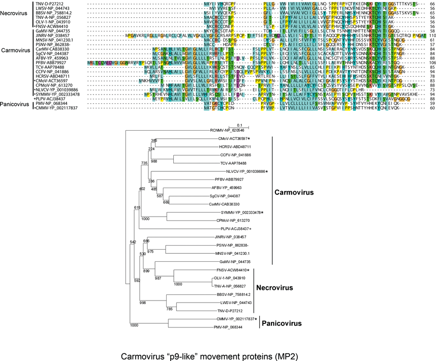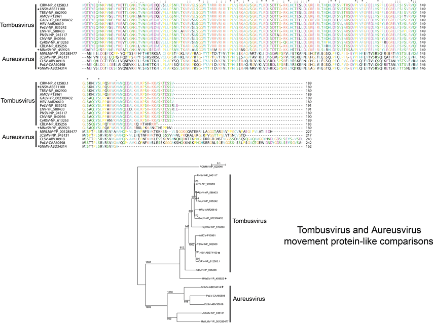Sequence comparisons of the MPs indicate that there are three main groupings that are phylogenetically unrelated. The dianthoviruses encode a 32 kDa MP which is not related to the MPs of other members of the family. The tombusviruses and aureusviruses share a similar movement protein (Figure 1). The remaining viruses with the exception of the machlomoviruses, encode two MPs that fall into two classes, MP1 and MP2 (see Figure S3,4). Machlomoviruses encode an MP1-like protein but not an MP2-like protein. Phylogenetic analysis of the MP2-like protein may be a useful taxonomic tool since members of a genus show a greater phylogenetic relationship to each other than they do to members of other genera (see Figure S4). MP1 comparisons would not appear to be useful since the phylogenetic groupings are weak and are not in agreement with current taxonomic groupings.