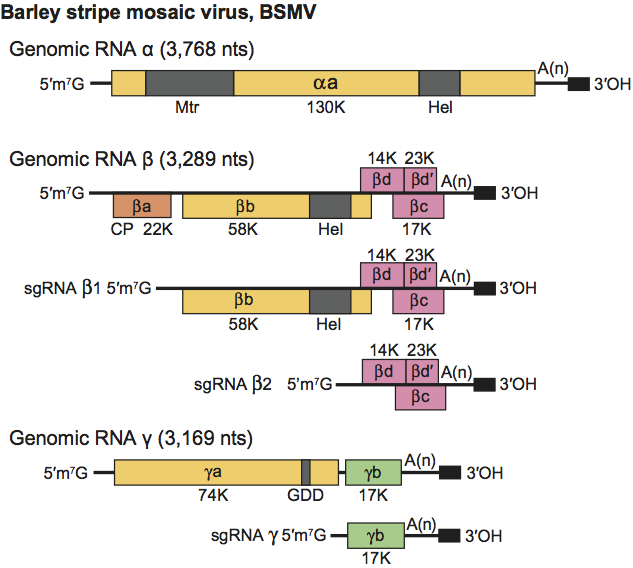 Figure 5 Genome organization of barley stripe mosaic virus (BSMV). The color rectangles and smaller solid black rectangles represent the ORFs, and the 3-terminal tRNA-like structure, respectively. The 3-proximal ORFs on each RNA terminate with an UAA that initiates the short poly (A) tract that directly precedes the 238 nt tRNA-like terminus. RNA encodes a single protein, a, with an amino-terminal methyl transferase domain (Mtr) and a carboxy-terminal helicase domain (Hel). This protein is referred to as the helicase subunit of the replicase (RdRp). RNA encodes five proteins: a, the CP is translated from the genomic RNA; b, a 58 kDa protein that contains a helicase domain. b is translated from sgRNA1, whose promoter resides between positions 29 to 2 relative to the transcription start site; c, a 17 kDa protein that is separated from the b ORF by 173 nt; d, a 14 kDa protein which overlaps the b and the c ORFs; and d, a 23 kDa translational extension product of unknown function. The d, d, and c proteins are translated from sgRNA2. The sgRNA2 promoter is located between nt 32 to 17 relative to its transcription start site. RNA encodes two proteins. The a protein contains the GDD domain and is the polymerase subunit of the replicase. The cysteine-rich, 17 kDa b protein has RNA binding ability, and is translated from a sgRNA, whose promoter lies between positions 21 to +2 relative to the transcription start site.
