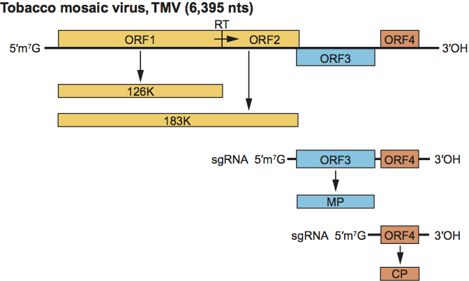 Figure 11 Genome organization of tobacco mosaic virus (TMV). Conserved replicase domains are indicated as shaded boxes. Genomic RNA is capped and is template for expression of the 126 and 183 kDa proteins. The 3 distal movement and CP ORFs are expressed from individual 3 co-terminal sgRNAs. CP=coat protein; MP=movement protein.