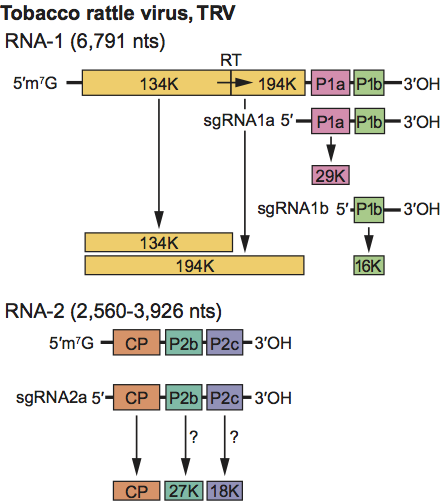 Figure 13 Genome organization and strategy of expression of tobacco rattle virus (TRV). The means by which P2b and P2c are expressed is unknown.