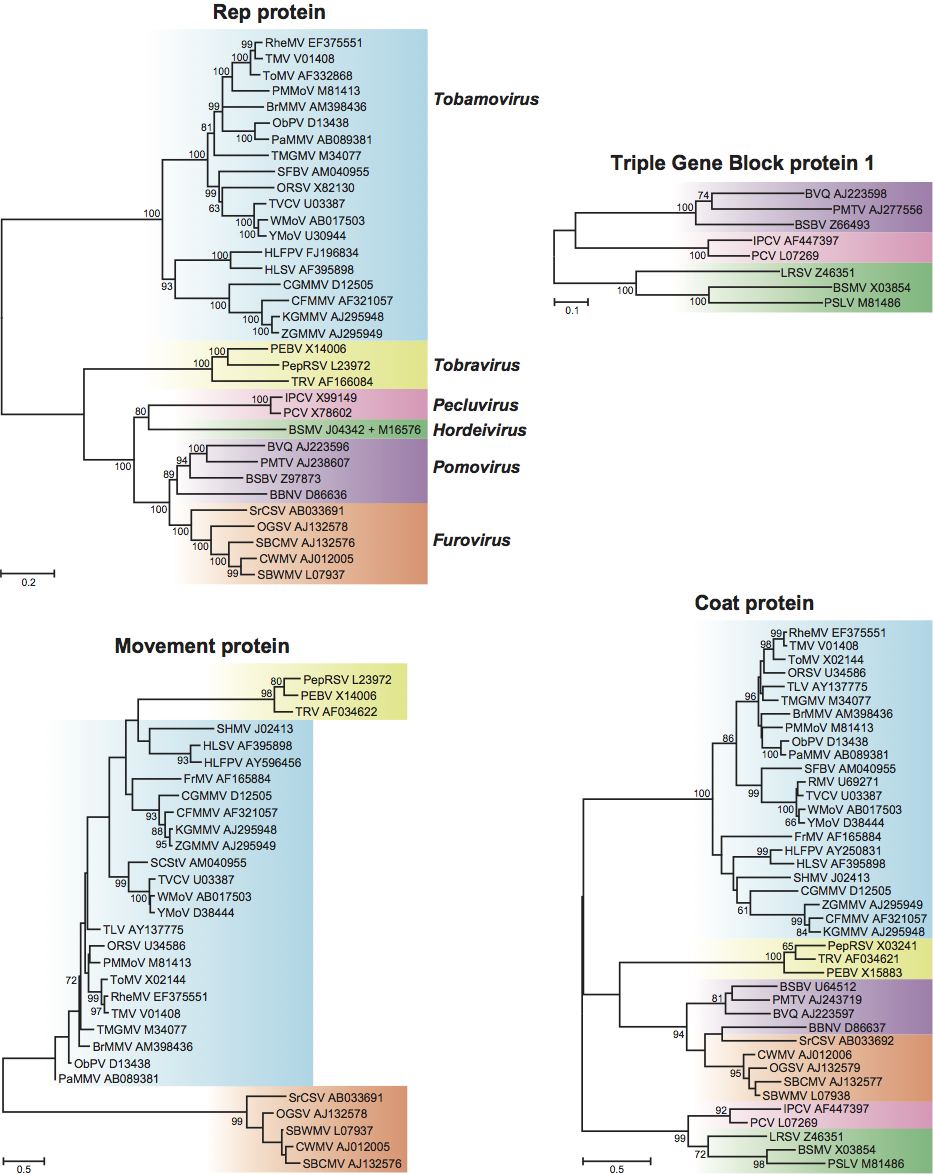 Figure 14 Phylogenetic (distance) trees based on the amino acid sequences of the entire replication protein, the Triple Gene Block protein 1 (TGB1), the movement protein and the coat protein. A single representative isolate of each sequenced species in the family was included. Numbers on branches indicate percentage of bootstrap support out of 1,000 bootstrap replications (when >60%). The scale indicates JTT amino acid distances. Trees produced in MEGA4. The BSMV replication protein was combined from two different genome components.
